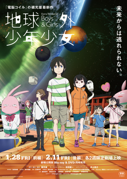 Chikyuugai Shounen Shoujo ONA Completed 2022 Pada tahun 2045, di mana Internet dan AI menjadi hal yang umum. Dua anak yang lahir di bulan dan tiga anak dari Bumi berusaha bertahan hidup setelah suatu kecelakaan di stasiun luar angkasa membuat mereka terdampar. Dengan menggunakan narrowband, jejaring sosial, dan drone yang dapat dikendalikan dengan smartphone dan AI, mereka mengatasi banyak krisis. |